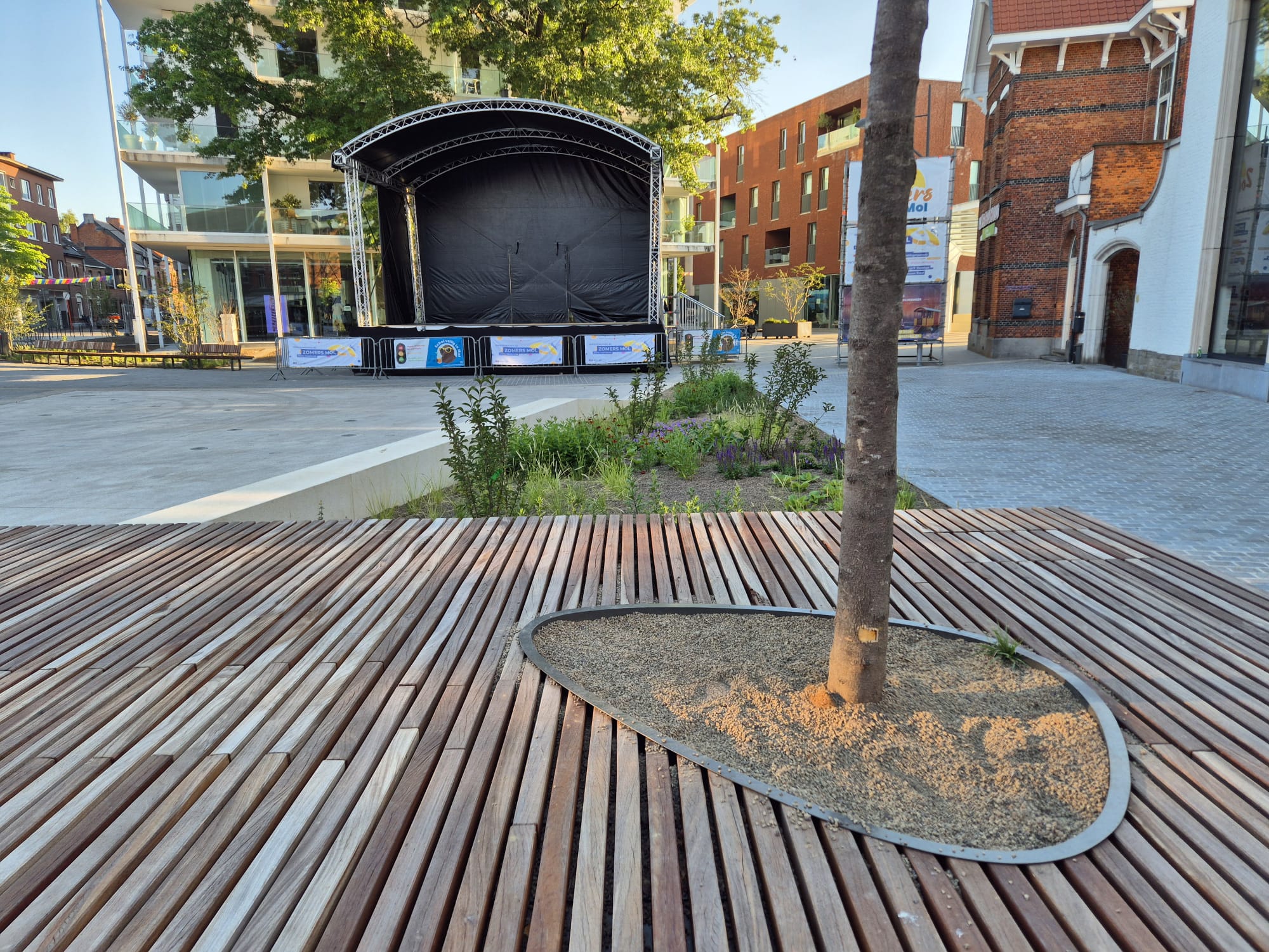 Tim Gielen: “De volledige zone Santo Tomásplein / Corbiestraat werd voorzien van extra groen – kleine boompjes en lage beplanting. Er zijn houten zitbanken geplaatst en in de Corbiestraat werden speelfonteinen, een stalen luifel met betonnen zitbanken en een podium geïnstalleerd. Fase één was, helemaal volgens planning, afgerond tegen einde maart. Deze timing was cruciaal omdat op dat moment de Jaarmarktkermis van start moest kunnen gaan.”