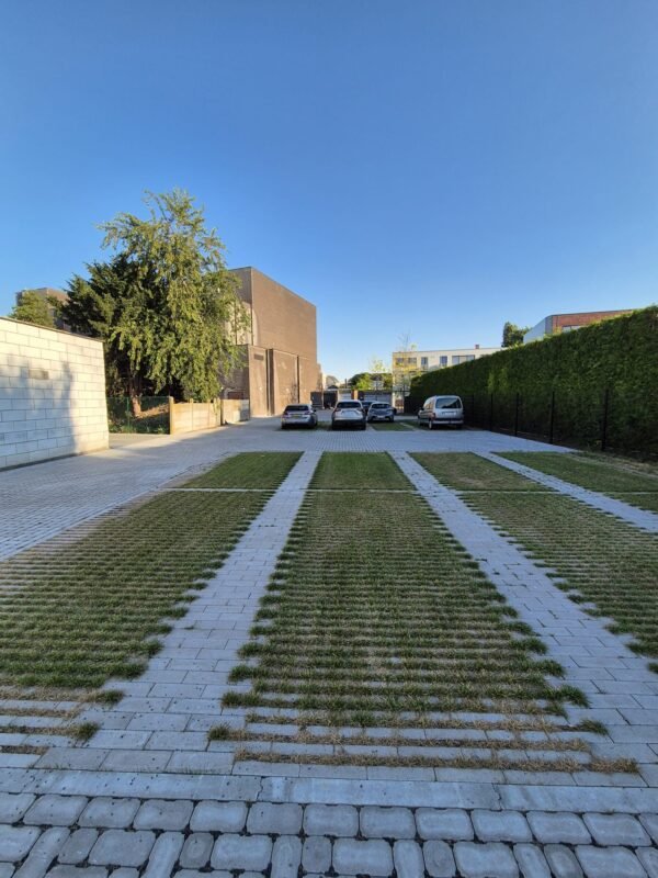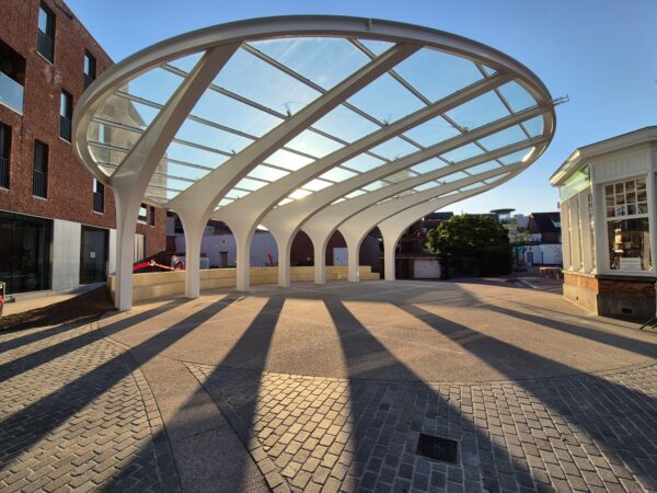Kijken we eerst naar fase één. We zijn in oktober van vorig jaar gestart met de afbraak van de bestaande verharding. Vervolgens hebben we rioleringswerken uitgevoerd en ondergrondse infrastructuur geplaatst die nodig was voor de latere installatie van speelfonteinen en een grote stalen luifel. Het Santo Tomásplein hebben we heraangelegd met rode kleiklinkers. In de Corbiestraat hebben we de originele kasseien opgebroken en nadien netjes teruggeplaatst. De Smallestraat was in feite een braakliggend terrein met een paar oude garageboxen. Die hebben we afgebroken en het perceel is omgevormd tot een centrumparking met 24 parkeerplaatsen, aangelegd met waterdoorlatende klinkers. Later wordt hier ook nog een overdekte fietsenstalling geplaatst.”